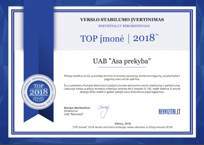 UAB „ASA prekyba“ įvertinta kaip TOP įmonė – skaidraus verslo plėtotoja, įmonės finansinės reputacijos bei atsakomybės ir pagarbos verslo aplinkai puoselėtoja.