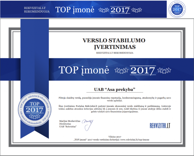 ЗАО “АСА Транспорт – Прекиба” было признано ТОП-предприятием – прозрачным бизнес-разработчиком, компанией, которая продвигает финансовую репутацию и ответственность компании и уважает деловую среду.